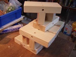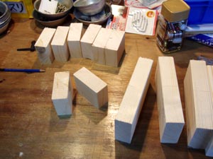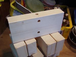 と言うわけで、別に「カン」にこだわる必要はない。それに、カンポックリで走ると踏みつぶして、足をくじくおそれがある。2×4材を使って「下駄ポックリ」にする 2×4材を7cmと20cmに切る。みんなで遊べるように、いくつか作ることにする。 |