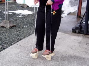 | 早速遊んでみる。快適。良くできました。 小さい子には歯のないポックリでも良いだろう。慣れたら、一本歯の下駄ポックリにする。 |