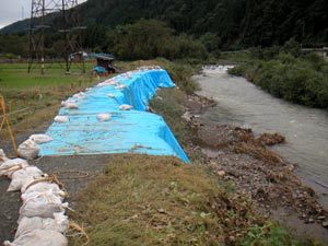 今回も「決壊」というからどんなことかと見に行ったら、川沿いの道が半分程削られただけだ。全部削られたって、その外側は田んぼで、もっと削られても山裾まで削られたらそこで終わりだ。