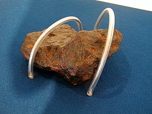 左の写真は美保関隕石のある「メテオミュージアム」の展示物の一つ、中国の「南丹隕石」。自由にさわれる。