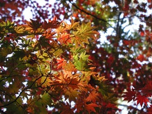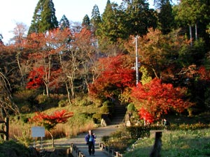 | 飯福寺に寄ったが、もう半分日陰になっていた。知人のM君に会ったので、「やっぱりダメかねえ。」などと話をする。 5年ほど前にかなりきれいに紅葉して、それが有名になってしまった。ところがその後はさっぱりダメで、見に来てくれる人に申し訳ない、などなど。 |