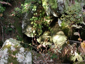 「おとちの洞穴」は「おろち(大蛇)の洞穴」だろうか。斜面の窪地の底に、やっと人が通れるくらいの穴が開いている。こういう構造なのに、中に水がたまらないということは、底が抜けているはずだ。 中は5m四方ほど有るそうだ。一人では危険だし、気色悪いので、入るのは止めておく。 |