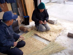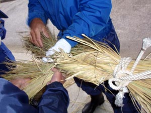 しめ縄作りにも色々流儀があるようだが、ともかく我が村の様式でやる。2本の縄をないながら、ねじり合わせていく。そこに後から1本絡ませて3本にする。