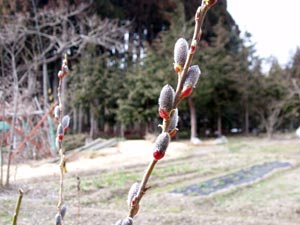 ネコヤナギやフキノトウも咲いている。少し盛りを過ぎたが、梅がきれいなので、一枝折って犬の墓に供える。