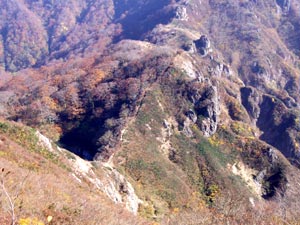 夜叉丸から見ると夜叉ヶ池のすぐ裏手が夜叉壁であることがよく分かる。夜叉丸から夜叉ヶ池に降りる所に少し危ない個所がある。多分夜で足下が見えずに、そのあたりから転落したのだろう。昼間なら注意すれば何でもないのだが。 中高年向きの登山の本に「ヘッドランプを必ず持って行け。」と書いてある。それを読んで、ヘッドランプを点けて夜間に下山を強行するバカ者が居るのではないかと気になる。 |