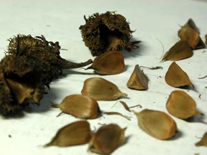 去年の秋に拾ったブナの実。足元を見るとビッシリ、というくらい大豊作だった。ブナは害虫を減らすために周期的に豊作の年と凶作の年が有るそうだ。