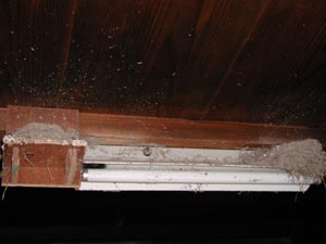 | 以前作った巣箱を戯れに車庫の軒先にぶら下げておいた。風が吹くとブラブラして住み心地が悪そうだ。 時々スズメがとまってさえずっている。多分あれは雄で、「僕と一緒に住まないか。」とパートナーを募集しているのだろう。 申し訳ないが、そんな不安定な家ではお嫁さんは来てくれないと思うぞ。 |
