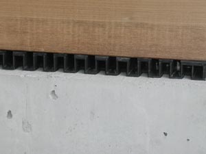 | 基礎のコンクリートに開口部が全然無い。風が通らないじゃないか、と聞いたら、この部分を教えてくれた。 全部の基礎と土台の間にプラスチックのグレーチングが入っている。ここから風が通るし、ネズミや猫は入れない。土台が基礎から浮いているので、湿気て腐るのが避けられる。 「基礎パッキング工法」と言うらしい。技術がどんどん進んでいくなあ。 |