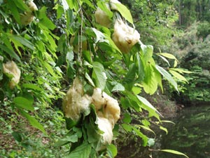 しばらく来なかったら、溜池にモリアオガエルがタマゴを生んでいた。生み立ては真っ白だがかなり表面が茶色くなっているので、日が経っているのだろう。 池のまわりが白くなるほどだから何万個ものタマゴだが、その内カエルになるのはわずかだろうから、自然は厳しい。 |