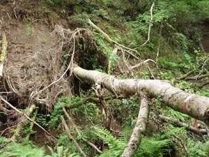 | この冬の雪で倒れた木が放置してある。倒木を見るといつも思うことがある。それは、広葉樹も針葉樹も違わないのになあ、ということ。 どういう訳か「広葉樹は根が深いので、保水力がある。針葉樹はダメだ。」と主張する人が多い。特にスギは目の敵にされる。 実物を見てから主張すれば良いと思うのだが。 |