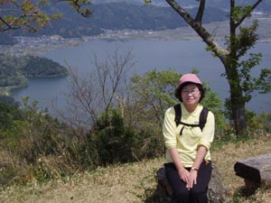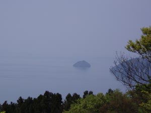 山頂よりびわこを見る。近江八幡辺りまで見えるはずだが、霞んで見えなかった。黄砂かも。眼下にある竹生島も少しボンヤリしている。 |