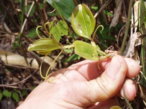 | 妻の目的の一つはガラタテの葉っぱだ。子どもの日なので、ガラタテモチを作ろうというわけだ。 今年は気候のせいか、まだ小さくて、モチには使えない。代わりにチマキを作ろうと、笹の葉を採って帰る。ついでに笹のタケノコを少し採ってみる。焼いて醤油をかけて食うと美味いそうだが。 |