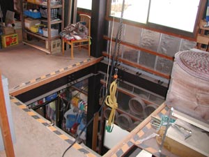 2階の床板をはずして、田植機を2階につり上げる。 車庫の天井は高いので、ここからのぞき込むと、実は相当怖い。 |