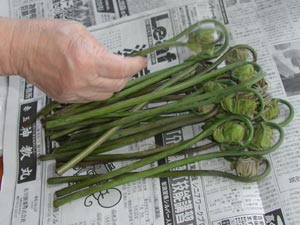| ワラビもたくさんあったようだ。 ここ数年、京阪神や岐阜名古屋方面から山を荒らしに来る連中が多くなったが、山道から離れると十分ある。 当人は荒らしに来たとは思っていないようで、「山菜採りに来ました。」などと平気で言う。以前、「松茸を採りに来ました。」という豪傑に会ったことがある。 |