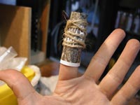 ハガキを丸めて、麻ひもを巻き、木工ボンドでとめる。こうすると、紙粘土がすっぽ抜けない。 紙粘土で形を付ける。 |