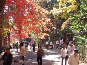 写真ではきれいに見えるが、実際には茶色になってしまった葉が多く、全然駄目だ。雲が切れて日差しが強くなったところを狙って、逆光で撮れば何とか見られる写真になる。 中高年のアマチュアカメラマンがいかにも高価そうな機材を抱えて行き来しているが、良いスポットはそれほど無いので、その辺は渋滞気味だ。 |