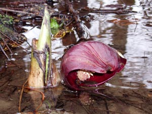| と言うわけで、口直しに敦賀のパソコン屋に行く。やはり専門店は話がわかりやすく疲れない。安物のビデオカードなど買う。160Gのハードディスクが5000円で、物欲を刺激されたが、さしあたり必要ないので我慢する。 帰りに柳ヶ瀬トンネルを通って中河内へ行く。中河内はまだ20cmほど雪が残っていたが、座禅草の群生地はわき水のためか、そこだけ雪が解けていた。 |