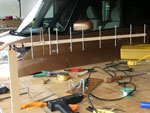 車庫の屋根に何本かアンテナをあげている。アンテナの取り付け場所が無くなったので、新しく屋根馬を設置する。 車庫は折板の陸屋根だ。此に合う屋根馬を2×4材で作ってみた。出来上がりはこんなものなので、作るのは簡単で、もっぱらペンキ塗りに時間をかける。 |