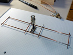 ダブレットにλ/4のトラップを組み合わせたアンテナ。比較的広帯域で、ノイズが少なく、良く飛ぶアンテナだそうだ。 この評価には賛否両論あるのだが、実験で確かめるのはまた別の機会にする。とりあえず、今必要な50MHzのアンテナをつくる。 実験は144MHzあたりがやりやすいので、そちらで。 |