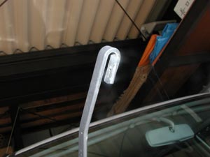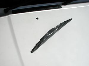 U字形のロッドに引っかけてあるだけなので、レバーを押しながら根本の方にスライドすれば簡単にはずれる。新しいブレードを引っかけてカチリというまでスライドさせればできあがり。ワイパーの交換くらいで車屋さんに持って行くのはもったいない。