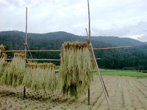 | これは米を干そうとしているのではない。農作業に使うワラを確保するため。「ハサ」(地方によっては「ハタ」「ハッタ」「稲木」)が懐かしいので、撮ってみた。 ハサを架ける時期には台風が多い。台風でも倒れないハサを架けるには技術が必要だ。以前は台風が来ると、風雨の中、ハサを見に行ったものだ。 |