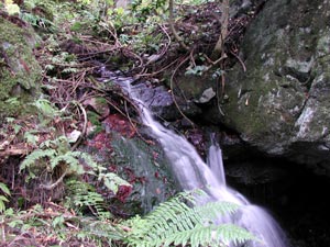 この辺りは石灰岩質で、近くにかなり深い風穴が有ったようだが、危険なので今は入口を埋めてしまってある。おとちの洞穴のような窪地を他にも見かけた。案外、地下は空洞なのかも知れない。 谷川も大量の湧き水から始まっている。近くには、昔、石灰焼きをしていた窯の跡の石垣が何カ所か残っている。 |