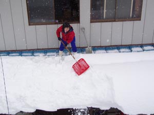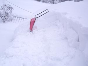 | 妻も車庫の庇の雪下ろしを始める。車庫は鉄骨建てなので壊れる心配はないが、ズルズル落ちてくると面倒なので、落としてしまう。 | ![]() |