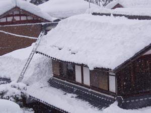 雪下ろしが手遅れで垂木が折れた家もある。大屋根のひさしの真ん中あたりが下がっているのがわかるかな。 このくらいと思っていたが、結構重い雪だ。 |
