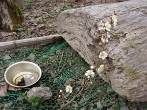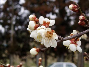 ネコヤナギやフキノトウも咲いている。少し盛りを過ぎたが、梅がきれいなので、一枝折って犬の墓に供える。