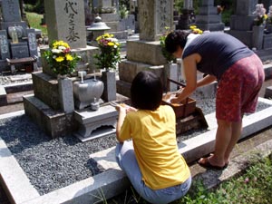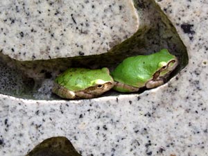 なにを思ったか、アマガエルが「南無阿弥陀仏」の文字の間に座り込んでいる。そこは涼しいのかな。