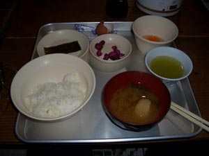 | 隣に座った人が「究極に質素だなあ」と言った大門沢小屋の朝食。私はそうは思わないが。 この朝食を最後に山を下りて、家路につく。大門沢小屋を出てすぐに岩に左膝をぶつけて、泣き泣き下山する。左足をかばいながら降りたので、時間が余分にかかってしまった。 |