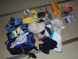 今回の荷物。小屋泊まりなので4日分でも8kgちょうど。練習登山では最大20kg近くまで担いだので、楽勝だ。 |