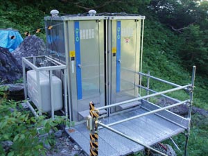 | 広河原から北岳に登る山中でブーンという音がすると思ったら、なんと公衆便所(!)がある。バイオ式の超高級トイレ。ブーンという音は発電機の音だった。さすが南アルプスのメインストリート。恐るべし。 | ![]() |