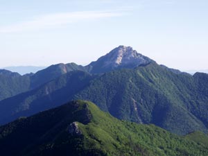肩の小屋のあたりから甲斐駒がよく見える。まだ縦走2日目だというのに、もう次はあれに登りたいなあなどと考えている。 手前は小太郎山。 |