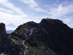 この角度から見ると、北岳山頂は台形のようだ。とがっていて、かなり狭いイメージを持っていたのでちょっと意外。 人がたくさん居るのが見える。 |