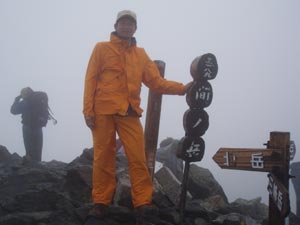 | 1,2日目は快晴だったが3日目はべったりガス。その内晴れるかなと、期待していたが、間の岳の山頂についてもまだなにも見えない。 昨日は時間がたっぷりあったのだから、晴れている内に農鳥小屋まで行っておけば良かったと、悔やむことしきり。 |
