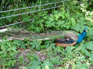 | なんと、雄雌2羽のクジャクだ。逃げ出してこんな所まで来ることは無いから、誰かがここで捨てたのだろう。「捨てクジャク」というのは初めて見た。長生きはするものじゃ。いやいや眼福をいたした。 帰りに同じ所を通ったら、パトカーはなくて、クジャクはまだ居た。どうやら捕まえられなかったのだろう。 |