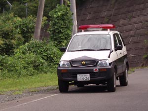 出発して間もなく、山の中でパトカーが2台止まっている。何事かと近づいてみると2台のパトカーの間、ヤブの中にゴソゴソ動くものがある。小さい。小熊かな。さらに近づいて、お巡りさんに声を掛けてみる。 逃げるといけないので、専門家が来るまで見張っているという。 |