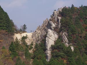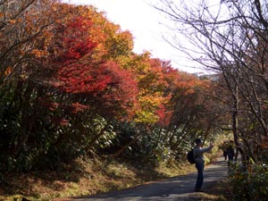 ともかくロープウェイには完璧に一番乗りで、気分良く山頂に着く。少し霞んでいて、遠望はきかない。 御在所岳は山頂が広く、ちょっとしたスキー場や山上公園がある。今日は登山ではないのでズルをして、リフトで三角点まで行く。 紅葉を見るには少し遅かったが、所々残っていて美しい。 |