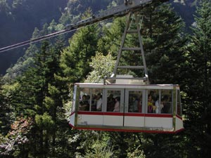 | 満員のゴンドラがしきりに行き交うが、行列は全然減らない。私たちより少し後に来た人たちは3時とか4時まで待つことに。 近くの滝まで散歩に出かけたが、滝を見るためにまた行列が出来ている。昼飯など食って、ウロウロと時間をつぶす。 |