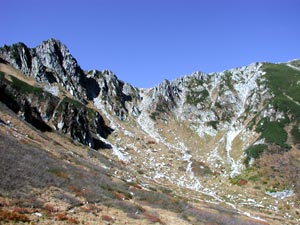 | 昨日とはうってかわって、雲一つ無い秋晴れ。ポカポカ暖かい。北アルプスで何件も遭難が有った翌日とは思えない。やはり秋の山は怖い。 とがった山も良いが、こういう雄大な氷河地形には強く引きつけられる。 |