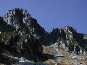 | カールの上部は険しい岩山なので、アップの写真を撮る。しかし後で見比べると、全景の写真の方がずっと良い。 近頃、広角をセールスポイントにしたデジカメが幾つか売り出されたが、どの程度売れているのかな。 |