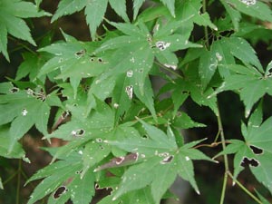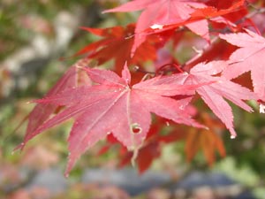 一部紅葉して、観光客もボチボチやって来た。紅葉した葉もまだの葉も虫やら雨やらで傷んできている。色もスッキリしない。