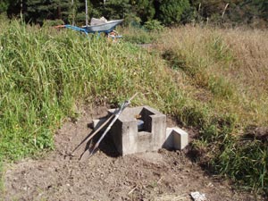 きれいに埋め戻して、掘り出した石ころを一輪車に積んで、捨てに行こうとした。重い。この土手を上がるのは無理か。えい、やっ!!ガラガラ、ガッチャ〜〜ン!!
