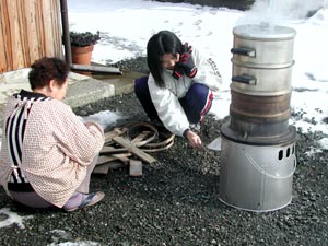 | ポータブルのかまどは安い(4000円弱)ので新調した。前のはボロボロで、釜を乗せるとつぶれそうだったので。 セイロは壊れて1個しか残っていないので、上2段はアルミ製だ。実はアルミ製の方が余程早く蒸し上がるのだが、雰囲気を出すために木のセイロも使う。 |