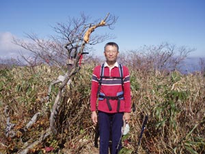 | 夜叉姫までは割合と行きやすい。そこから三国岳までは笹がかなり深い。行きは良かったが、帰りにちょっと迷ってしまって、木に登って確認するはめになった。 まさかと思ったが、ここで人に会った。お互いにシャッターを押す。 同僚のT君が先週滋賀県側から登ったと言っていた。それらしい赤テープがぶら下がっている。藪こぎマニアにはかなわんなあ。 |
