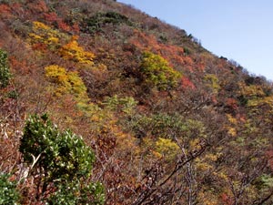 2時過ぎに夜叉ヶ池まで戻って下山する。夜叉壁直下で、背広の上下に革靴をはいた男性がペットボトル一つ手にぶら下げて登ってくるのに出会った。 下山の途中、夜叉姫が身体を清めたという「幽幻の滝」の丁度向かい側の斜面に大きめの滝が見えた。登山コースから離れているが、なかなか良さそうな滝だ。登山路の少し手前に沢に降りるマーキングがしてあったが、これのためか。 |
