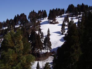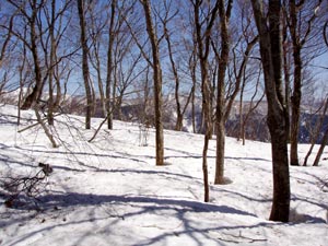 山頂付近には山スキーをする人なら喜びそうな斜面が有った。ここを下ると、石田三成のオトチの洞穴付近になる。 |