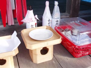 | 拝殿にはお鏡餅や御神酒を供える。お下がりの御神酒をいただけるように湯飲みなど用意する。お参りした人は茶わん酒を一杯グイッとやって帰るわけだ。 前日に供えておいた御神酒が凍っていた。酒が凍ったのははじめて見たが、余程冷え込んだのだろう。 |