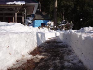 神社の除雪には足かけ3日かかった。 除雪車が巡回してくれる町道から神社までに半日、境内(鳥居から拝殿まで)の除雪に半日、神社係とおこない当番でボチボチ除雪する。 地蔵堂や拝殿の屋根雪が落ちたところは係の者だけではとてもやりきれないので、有線放送で有志をつのって協力してもらう。 |